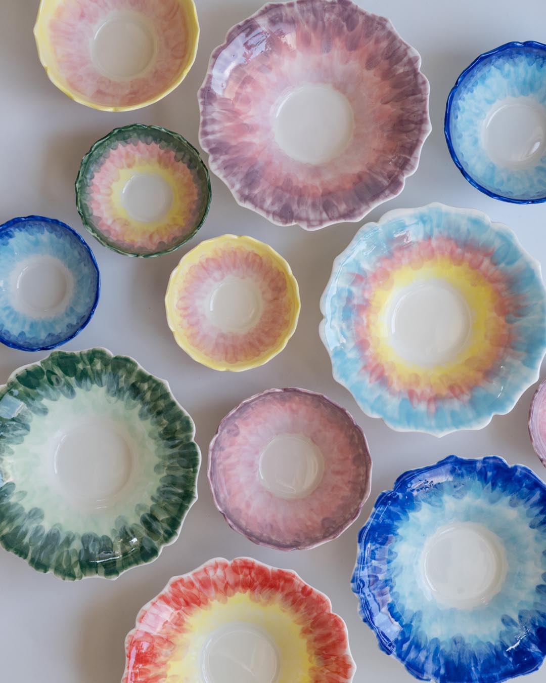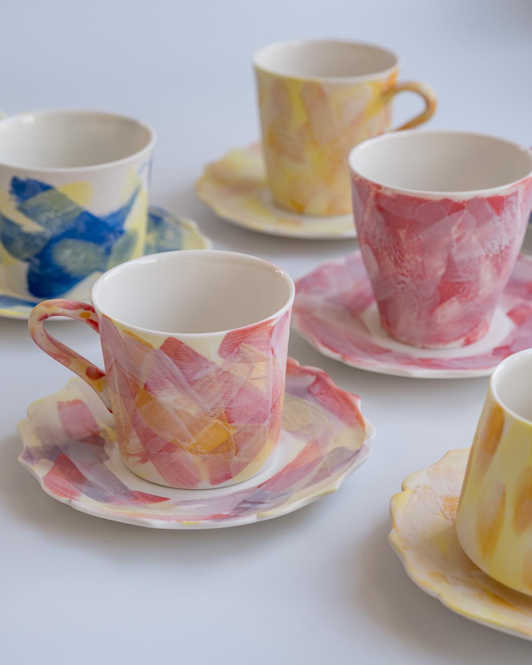 大きなストロークののびやかな動きや、にじむような彩りは、光を受けて刻一刻と表情を変え、食卓を明るくしてくれます。