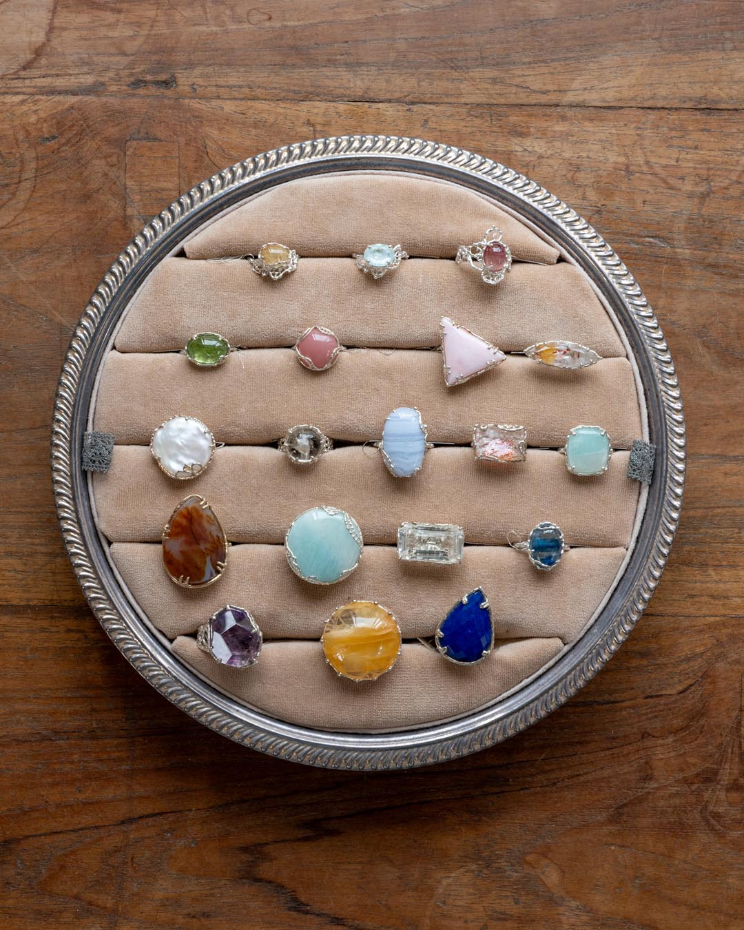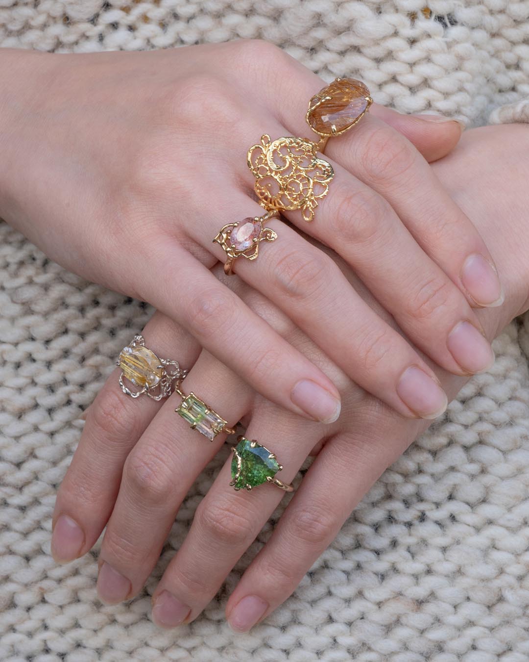 冷え込んで澄んだ空気が、kiriさんによって選び抜かれた天然石に光を差し、手を動かすたびに輝きが変わるリングたち💍