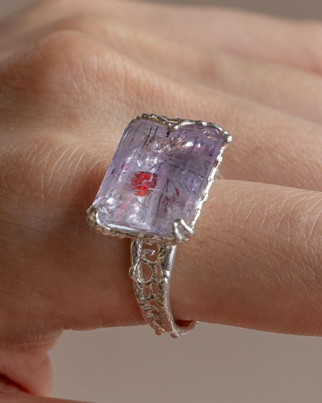 天然石の中に、赤や黒の針状の鉱物が内包された、個性的なインクルージョンが魅力のリングです✨