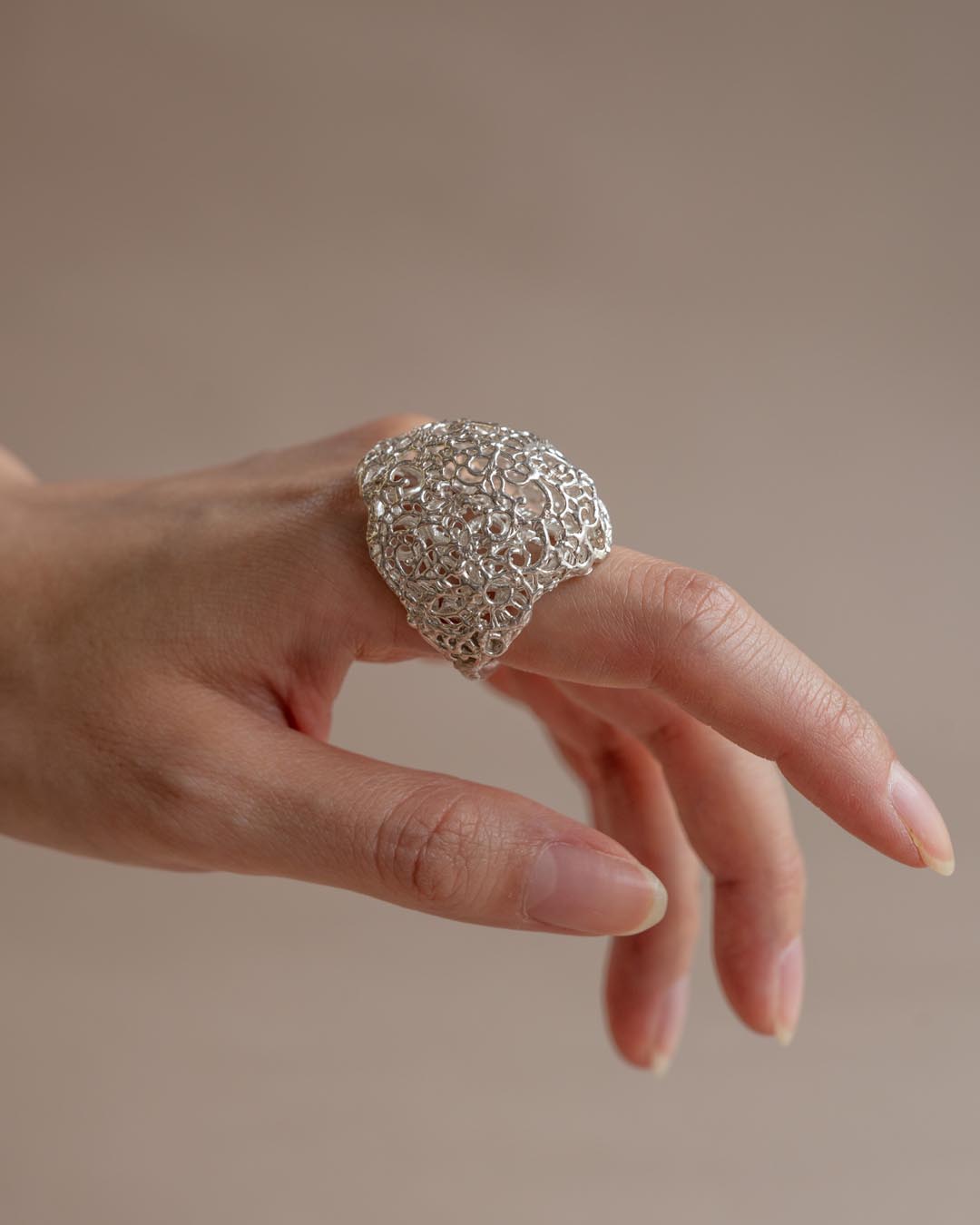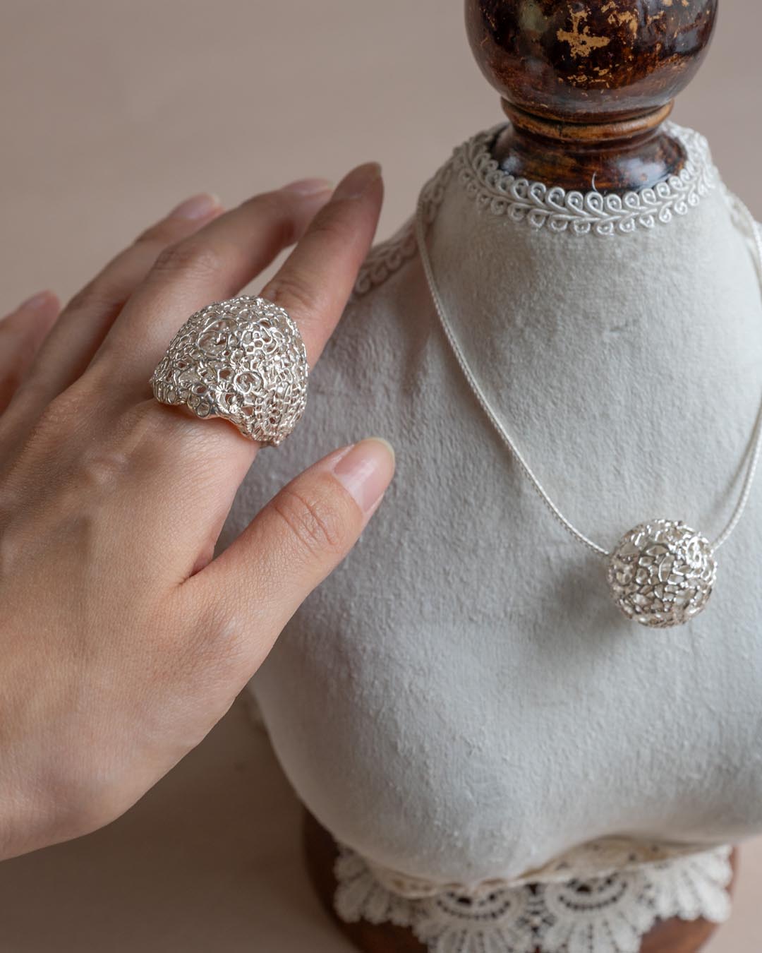 金属でありながら、まるでレースのように一線一線紡がれた繊細なデザイン。
