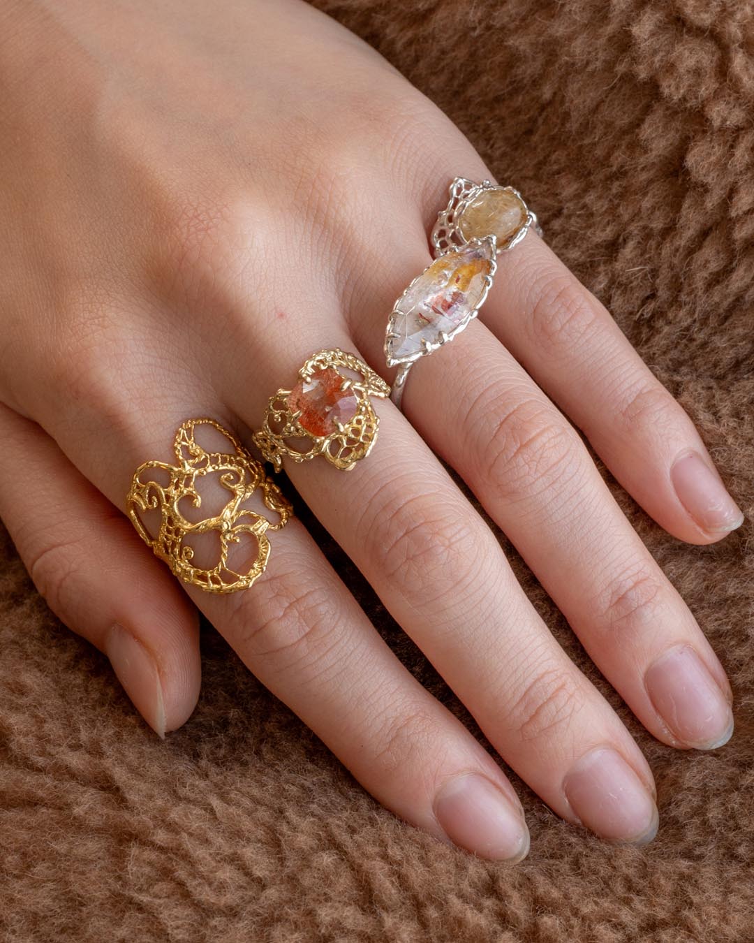 kiriさんのインスピレーションによって細部までこだわり抜かれたデザインは、天然石の個性に寄り添うように生まれます。
