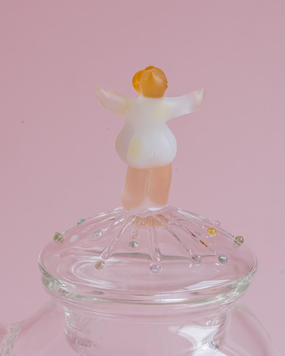 羽鳥景子さんの耐熱ガラス作品には、ガラスの中に小さな物語が隠されています。 ポットの中にはガラスのオーナメントが揺れ、マグカップのハンドルではおさげの女の子がぐーんと背伸び。 ひょうたんやお豆など、ユニークな形のアクセサリーは、冬の重くなりがちな装いに軽やかな光を添えてくれます。 いくつになっても心の中にいる「小さな女の子」を呼び覚ましてくれるような、ときめきに満ちた作品たちです。
