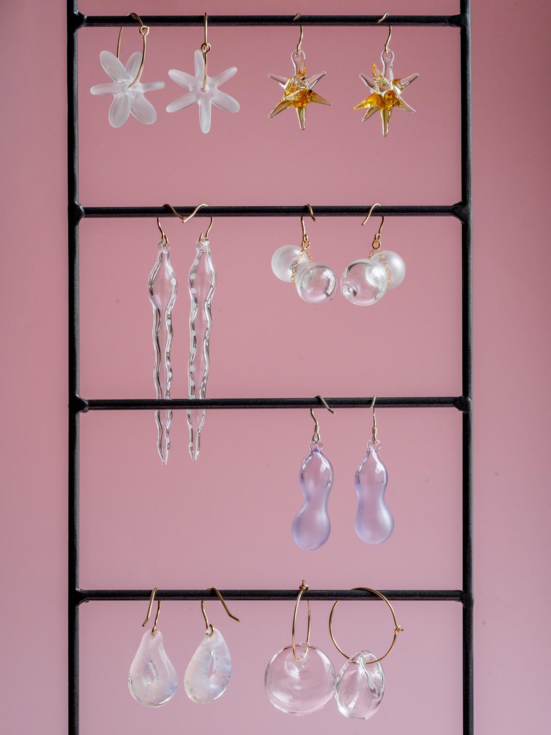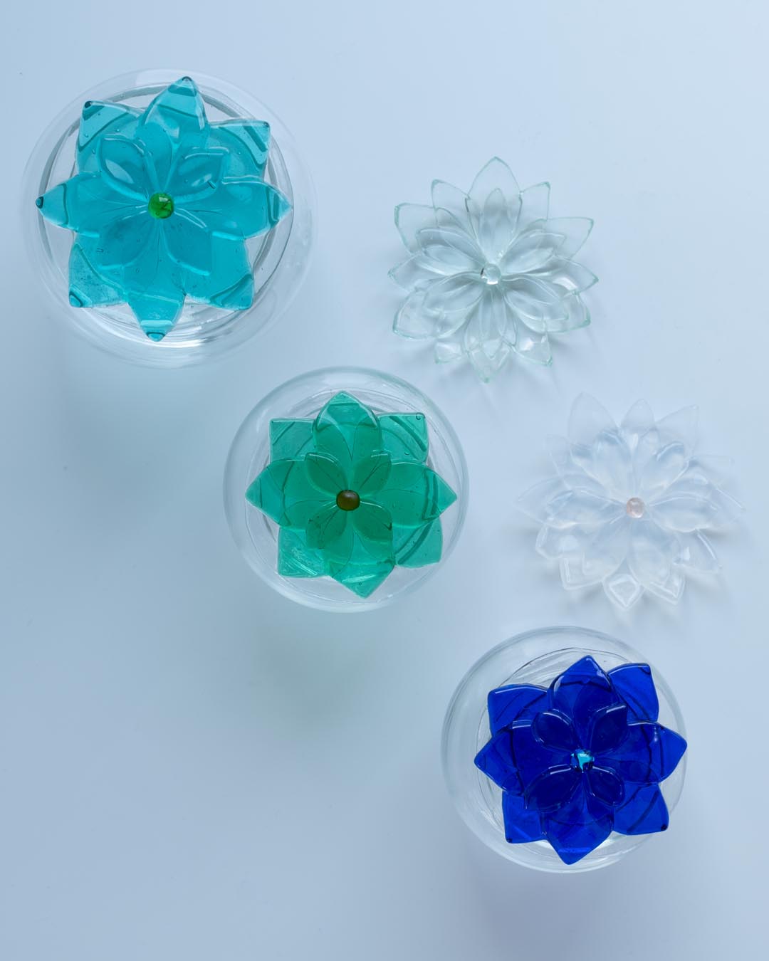 今回の新作「フラワーキャンディポット」は、涼やかな寒色系。 イタリアの水辺に浮かぶ花をイメージして作られており、あえて中身を満杯にせず「余白」を楽しむことで、透過する光の美しさを堪能できます。 ペンダントライトやアクセサリーなど、イタリアの華やかさと優しさが詰まった作品たちが、空間を温かく彩ります。