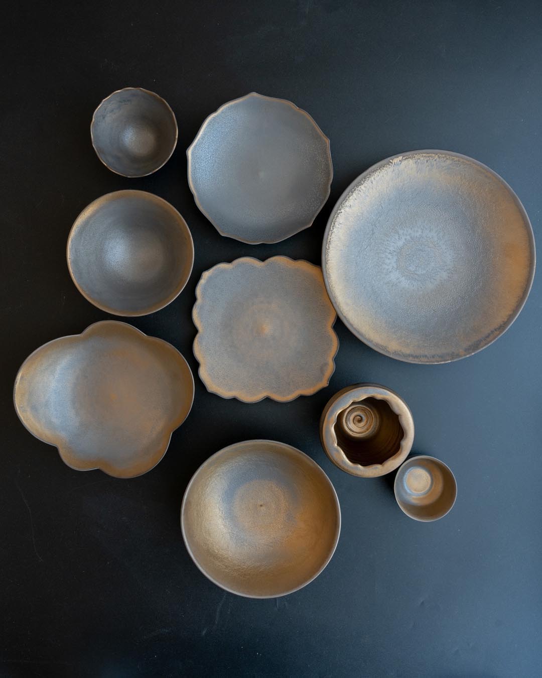 これからの季節には、金属のような鈍い輝きを放つ「ブロンズ釉」の作品もおすすめ。光の陰影を美しく映し出し、秋冬のこっくりとした色合いのお花や、温かいお料理をぐっと引き立ててくれます。