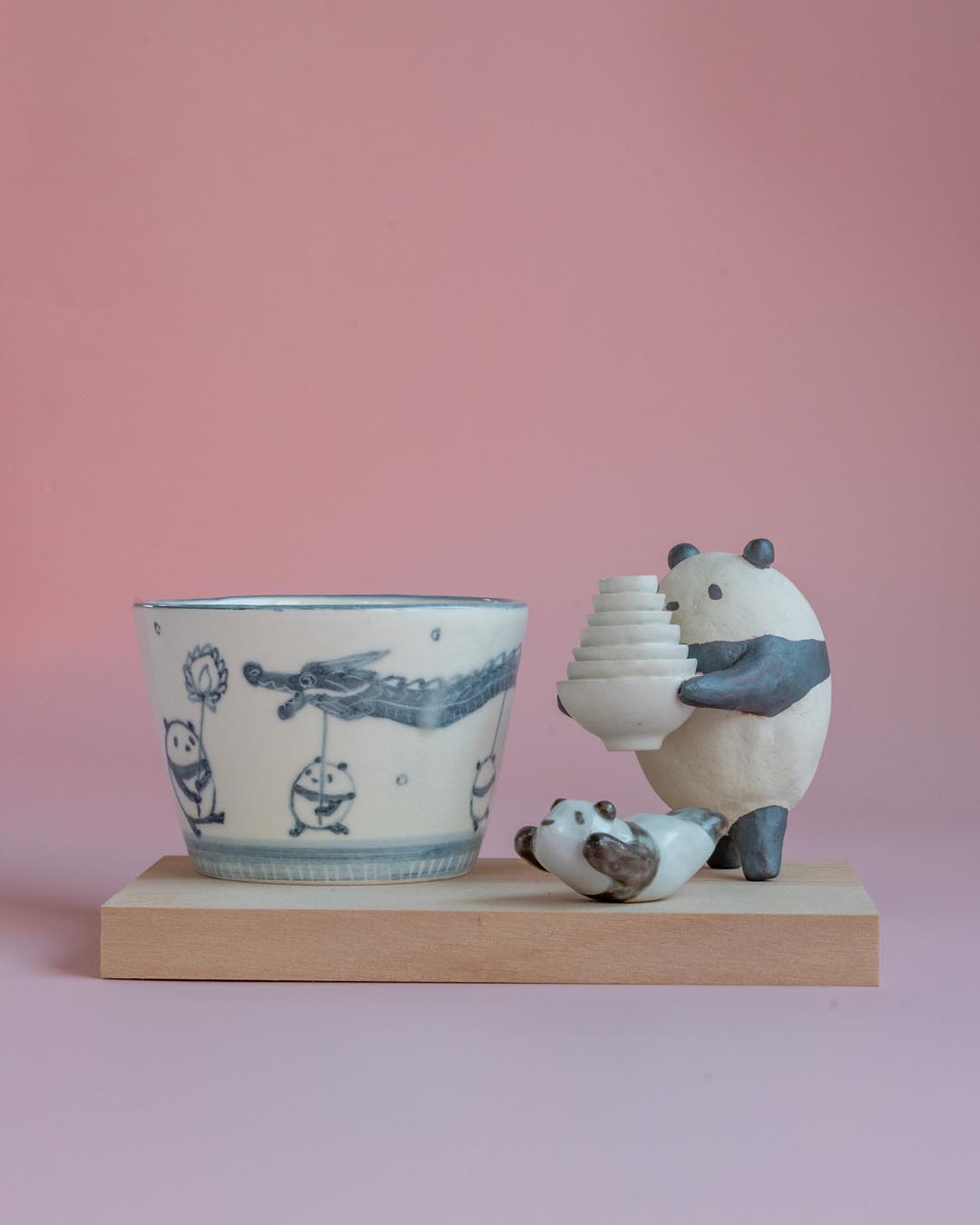 大隈音呼さんの陶磁器には、パンダやシロクマ、千鳥といった動物たちが、のびのびと描かれています。 龍をかついで舞うパンダの蕎麦猪口や、テーブルの上をスイスイ飛ぶようなフライングパンダの箸置き。どの子も表情豊かで、作家ご本人の優しいお人柄がそのまま形になったような「ゆるさ」に癒されます。